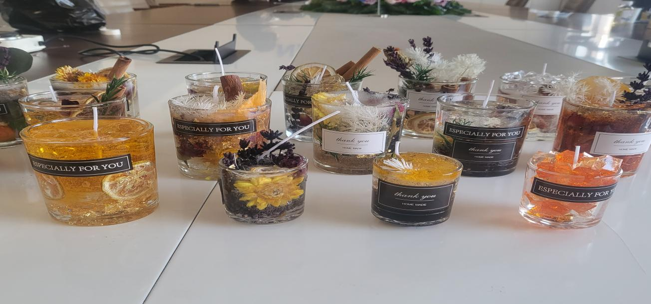 大家充分發(fā)揮創(chuàng)造力,經(jīng)過近一個小時的精心制作,一份份獨特的、充滿創(chuàng)意的香薰蠟燭完美的展現(xiàn)在我們面前。作品中香薰造型各異,也代表著大家不同的心境與體驗,鮮亮的橙色、清新綠色、淡雅的白色,花立于杯中,或安靜或灑脫,給人以美的享受。